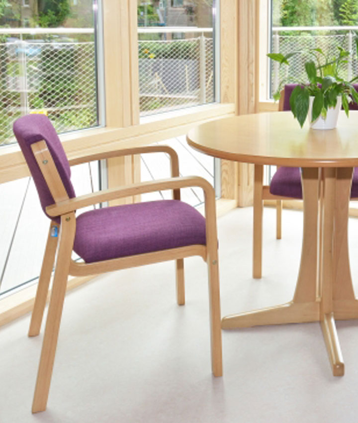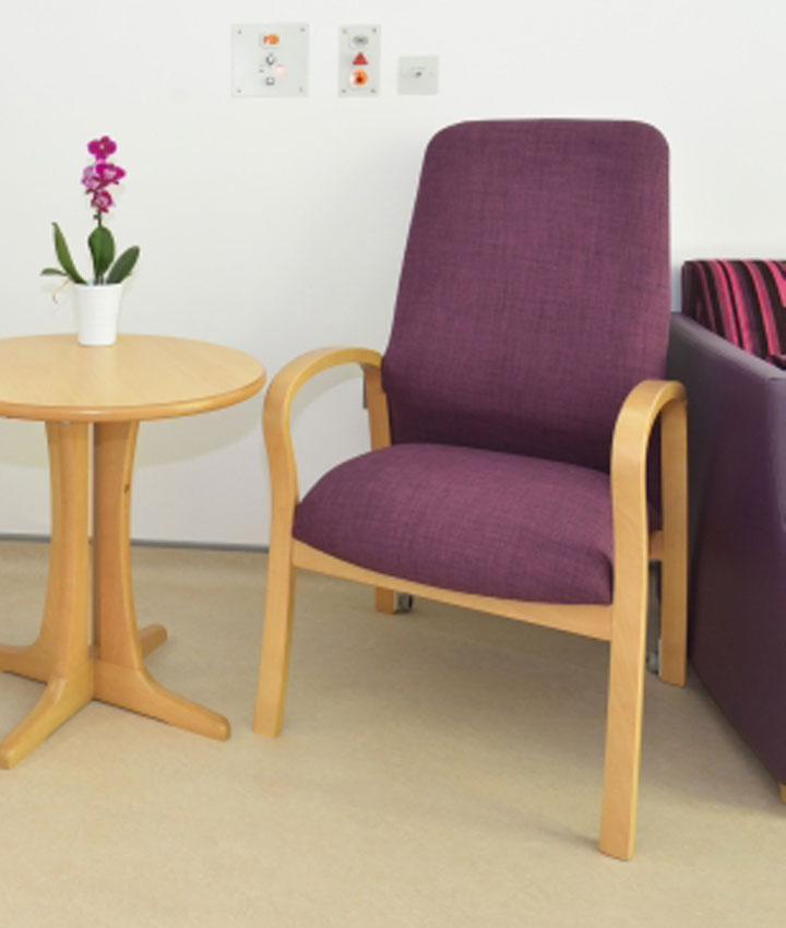 Smart upholstered seating welcomes Kirkwood patients and visitors alike, with mid-back and high-back chairs and three-seat settees from Knightsbridge Furniture’s traditionally-styled Jasmine range nestling alongside the more contemporary profiles of Maddie club chairs and supportive high-back armchairs from the company’s Arran range. Seating is on hand throughout the unit thanks to the provision of 50+ versatile Zeta stacking chairs, which are the perfect complement to the Harvey timber-topped tables in the dining area, Palma tables in the patients’ lounge and multi-bed bays, rectangular Polo and Ascot tables in the activity rooms and the neat Ventura lamp table in the beverage bay.